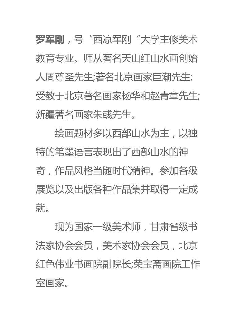 罗军刚,号“西凉军刚“大学主修美术教育专业。师从著名天山红山水画创始人周尊圣先生;著名北京画家巨潮先生;受教于北京著名画家杨华和赵青章先生;新疆著名画家朱彧先生。绘画题材多以西部山水为主,以独特的笔墨语言表现出了西部山水的神奇,作品风格当随时代精神。参加各级展览以及出版各种作品集并取得一定成就。现为国家一级美术师,甘肃省级书法家协会会员,美术家协会会员,北京红色伟业书画院副院长;荣宝斋画院工作室画家。